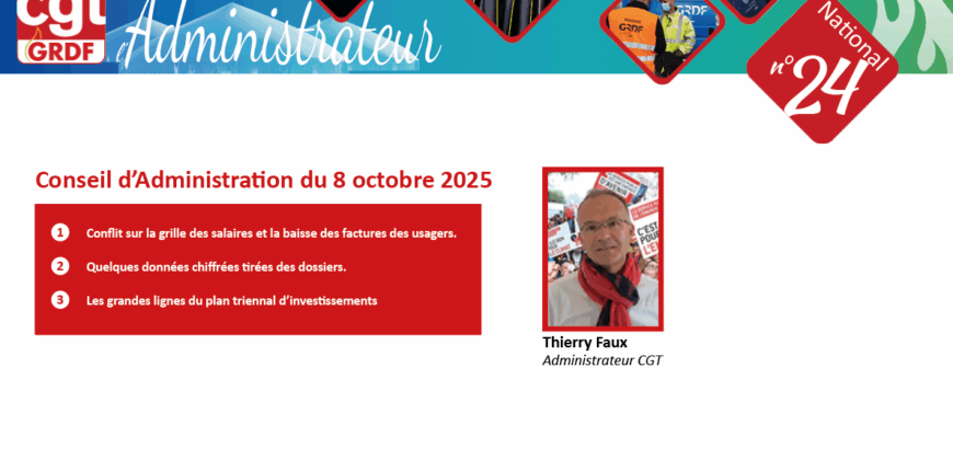 Le 8 octobre dernier, un séminaire et un Conseil d’Administration ont eu lieu. Je n’ai pas répondu à ces convocations car, depuis le 2 septembre, les agents du Service Public de l’Energie de la branche IEG se mobilisent fermement pour obtenir des avancées majeures : l’abrogation complète de la réforme des retraites, l’application d’une TVA à 5,5% sur l’ensemble des factures des usagers, ainsi que des revalorisations salariales significatives, notamment une augmentation de 9% afin de porter la grille des IEG au-dessus du SMIC. Ce sont des demandes légitimes des salariés que nous défendons.